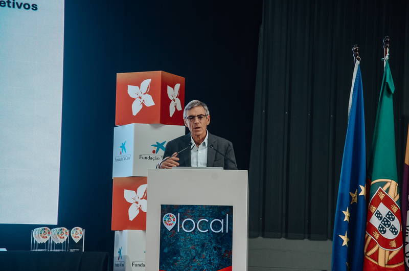 Professor João Ferrão, Coordenador da Plataforma ODSlocal, anunciando o Galardão de Mérito "Plataforma ODSlocal'25", este ano atribuído à Fundação ”la Caixa”