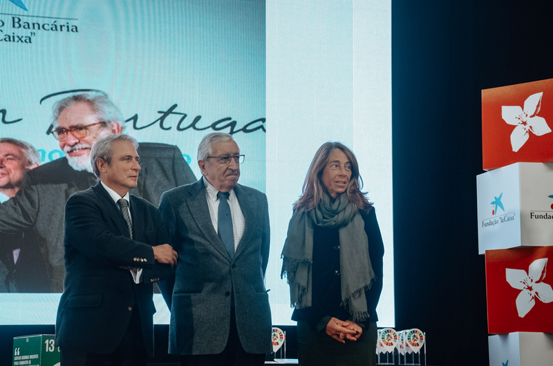 Artur Santos Silva, curador da Fundação "la Caixa“ recebendo o Galardão de Mérito "Plataforma ODSlocal'25", na presença de José Pena do Amaral e Maria João Cabral (ambos Fundação ”la Caixa”)