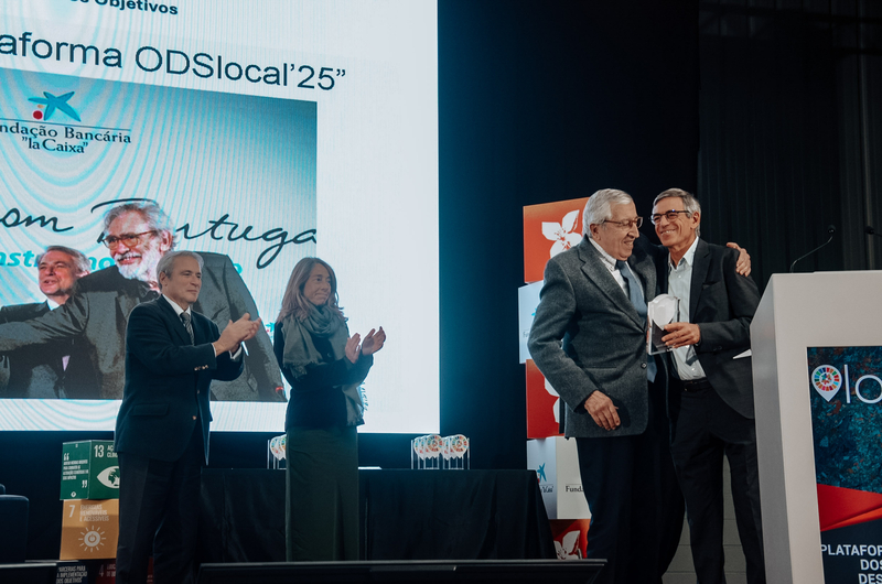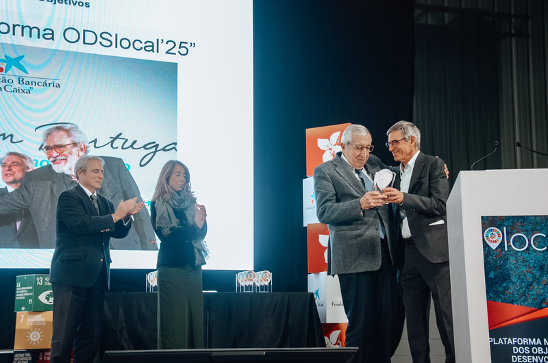 Artur Santos Silva, curador da Fundação "la Caixa“ recebendo o Galardão de Mérito "Plataforma ODSlocal'25" das mãos do Professor João Ferrão, Coordenador da Plataforma ODSlocal, na presença de José Pena do Amaral e Maria João Cabral (ambos Fundação ”la Caixa”)