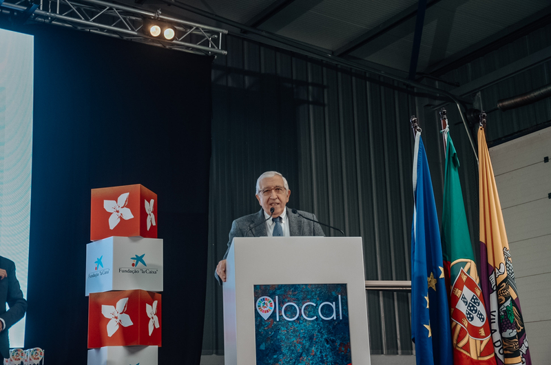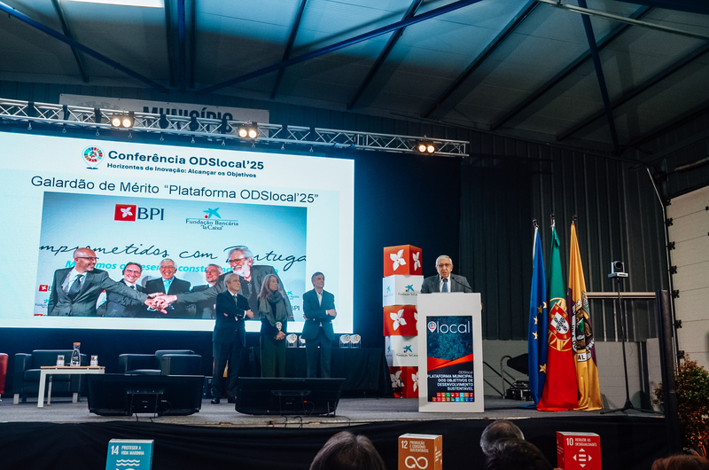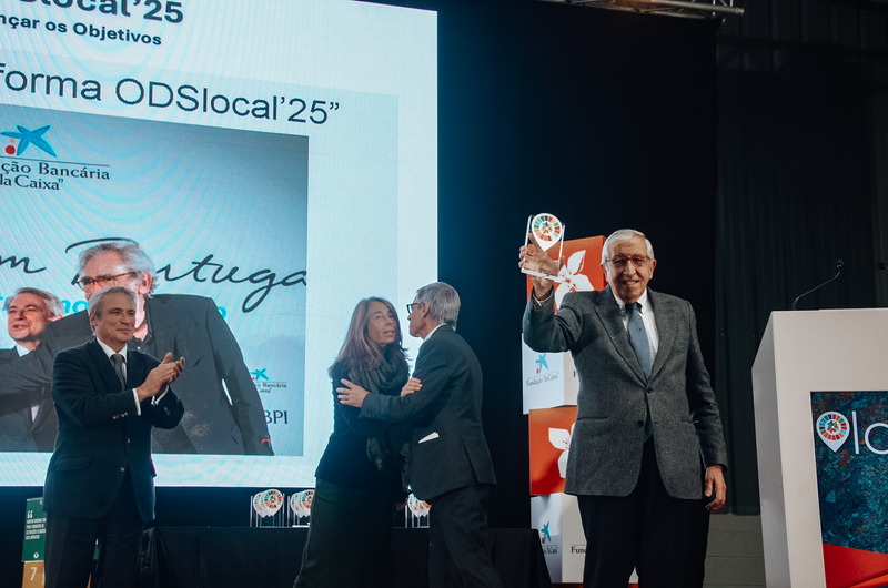 Artur Santos Silva, curador da Fundação "la Caixa“ agradecendo o Galardão de Mérito "Plataforma ODSlocal'25", na presença de José Pena do Amaral e Maria João Cabral (ambos Fundação ”la Caixa”) e na presença de João Ferrão, Coordenador da Plataforma ODSlocal