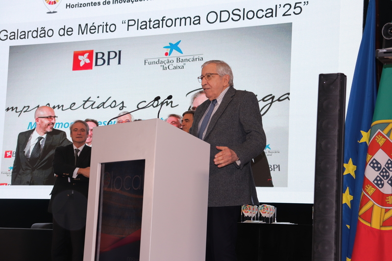 Artur Santos Silva, curador da Fundação "la Caixa“ agradecendo o Galardão de Mérito "Plataforma ODSlocal'25"