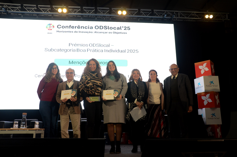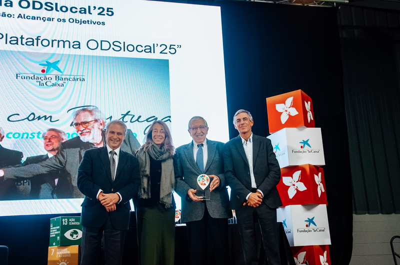 José Pena do Amaral, Maria João Cabral e Artur Santos Silva representando a Fundação ”la Caixa”, galardoada com o Galardão de Mérito “Plataforma ODSlocal’25” por todo o apoio concedido à Plataforma ODSlocal, acompanhados do Coordenador Professor João Ferrão.