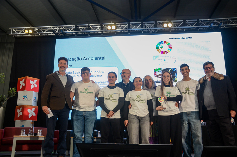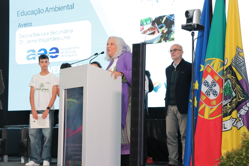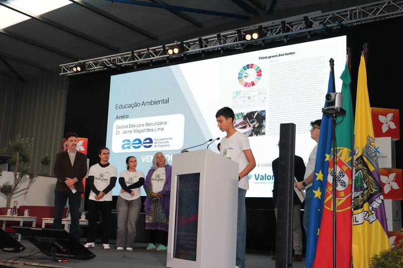 A equipa da Escola Básica e Secundária Dr. Jaime Magalhães Lima, juntamente com a Professora Leonor Metelo, na receção do Prémio de Educação Ambiental pelo Projeto "Think green, live better", entregue por Francisco Teixeira, membro do Júri e Diretor do Departamento de Comunicação e Cidadania Ambiental da APA, e Armando Militão, patrocinador e Administrador Executivo da Valorsul | EGF; moderador David Avelar (2adapt)