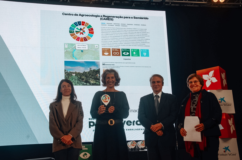 O momento da entrega do Prémio Projeto ODSlocal'25 Dimensão Planeta a Marta Cortegano (representante do Centro de Agroecologia e Regeneração para o Semiárido - CARES), pelas mãos de José Pena do Amaral, um dos membros do juri e membro do Conselho da Fundação ”la Caixa”, e de Luísa Pinheiro, representando a entidade patrocinadora Sociedade Ponto Verde, num painel moderado pela Professora Lia Vasconcelos, MARE – FCT NOVA