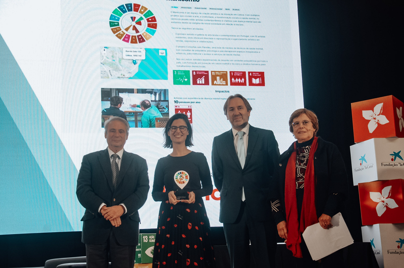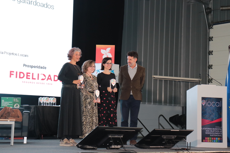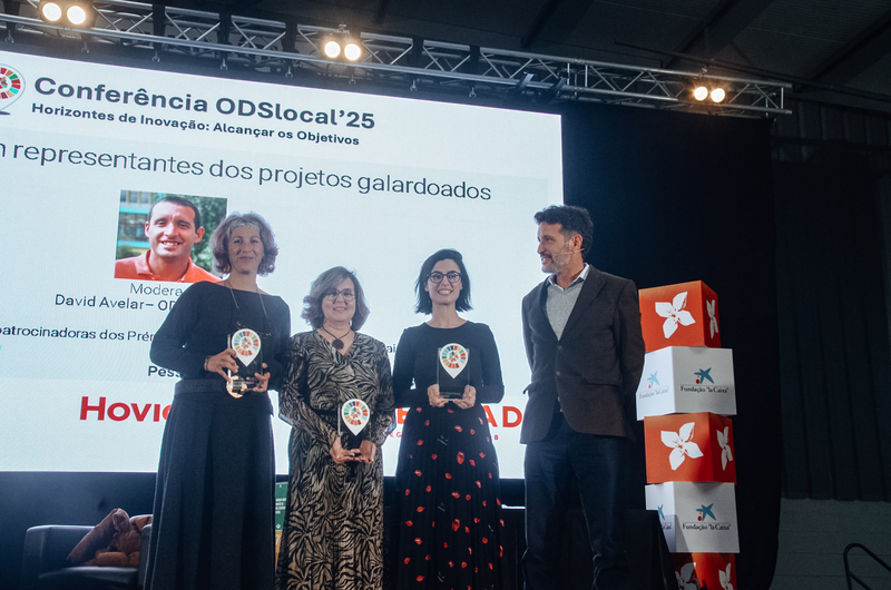 Galardões a Projetos ODSlocal, foto com representantes dos Projetos Premiados: da esquerda para a direira, Marta Cortegano (Terra Sintrópica), Catarina Gomes (Manicómio) e Sílvia Correia (re.store®) e David Avelar, 2adapt.