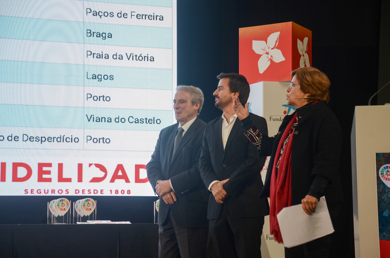 Lia Vasconcelos (MARE – FCT NOVA) anuncia o Prémio Projeto ODSlocal'25 Dimensão Prosperidade entregue por José Pena do Amaral, um dos membros do juri e membro do Conselho da Fundação ”la Caixa”, e de Henrique Gomes Silva, representando a entidade patrocinadora Fidelidade.