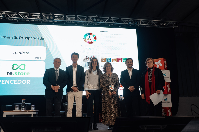 O momento da entrega do Prémio Projeto ODSlocal'25 Dimensão Prosperidade a Sílvia Correia (representante da re.store®), pelas mãos de José Pena do Amaral, um dos membros do juri e membro do Conselho da Fundação ”la Caixa”, e de Henrique Gomes Silva, representando a entidade patrocinadora Fidelidade, num painel moderado pela Professora Lia Vasconcelos, MARE – FCT NOVA