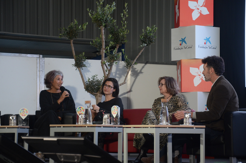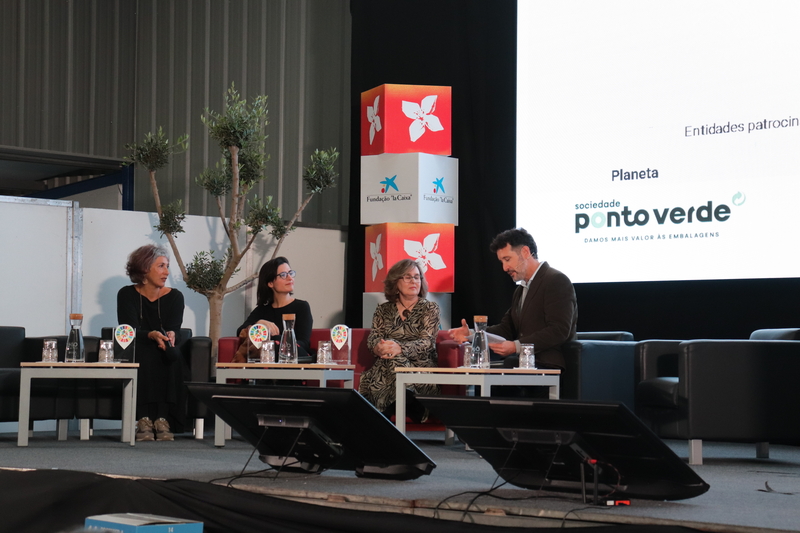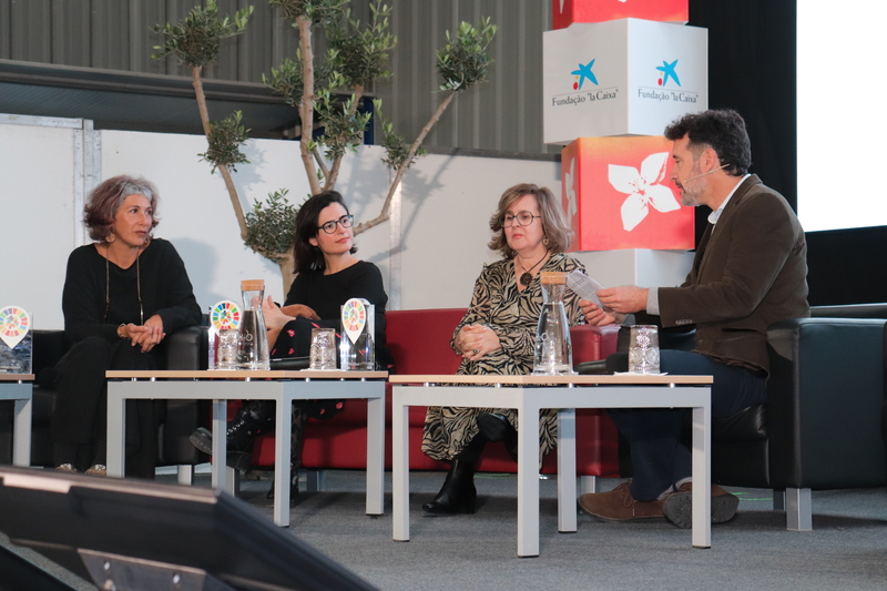 Galardões a Projetos ODSlocal, diálogo com representantes dos Projetos Premiados: da esquerda para a direira, Marta Cortegano (Terra Sintrópica), Catarina Gomes (Manicómio) e Sílvia Correia (re.store®) e David Avelar, 2adapt.