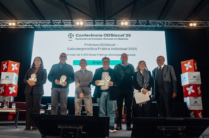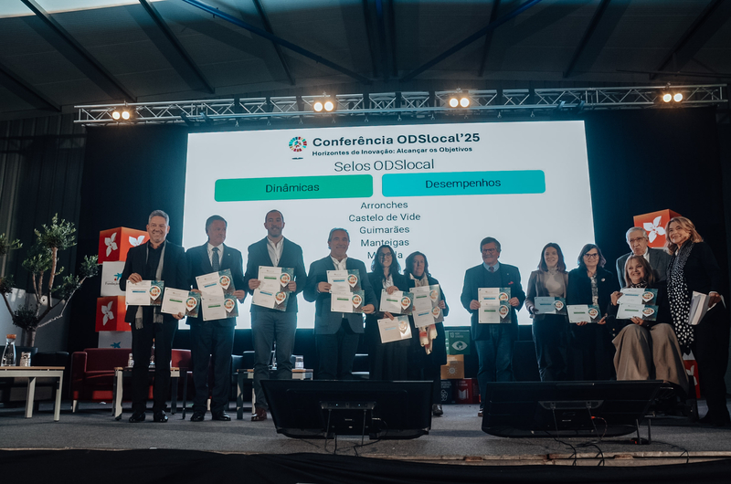 Os representantes municípios galardoados com os Selos ODSlocal'25 Dinâmica e Desempenho: da esquerda para a direita os representantes dos municípios de Mértola (Presidente Mário Tomé), Arronches (Presidente João Crespo), Castelo de Vide (Vereador Rui Bengala), Guimarães (Verador Constantino Veiga), Oeiras (Vereadora Mariana Campos Coelho), Portalegre (a Ponto Focal Maria Luciano Tavares), Sousel (Vereador António Dâmaso), Torres Vedras (Joana Rodrigues e Margarida Frade) e Vila Franca de Xira (Vereadora Manuela Ralha). Os galardões foram entregues por Artur Santos Silva, curador da Fundação "la Caixa“ e o painel moderado por Luísa Schmidt (ICS- ULisboa)