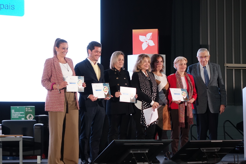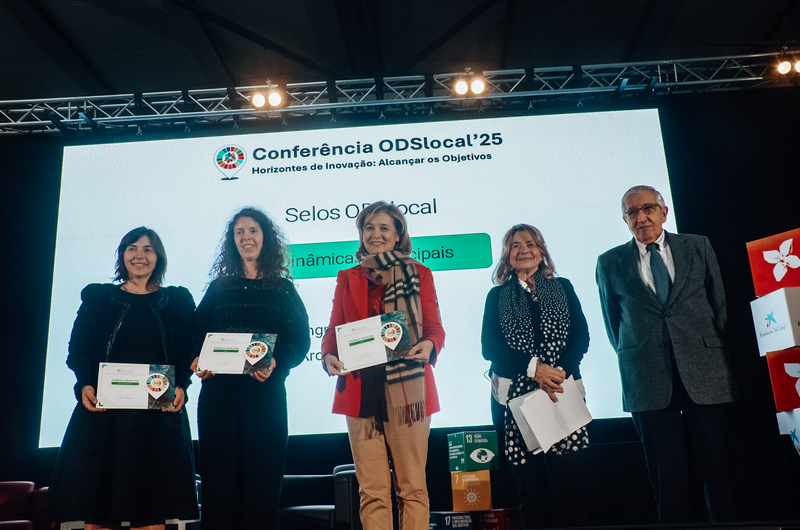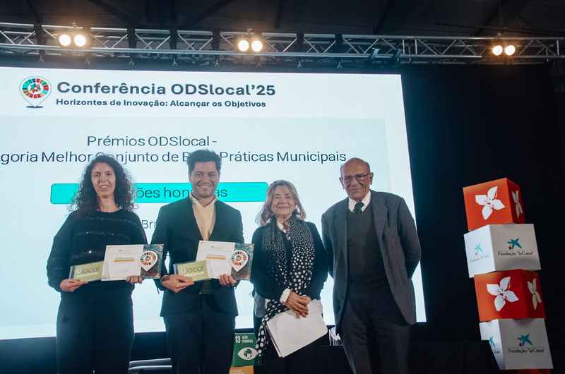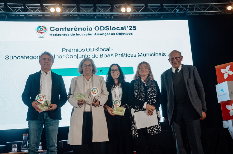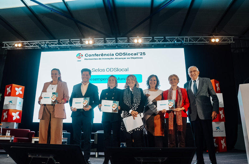 Os representantes dos municípios galardoados com os Selos ODSlocal'25 Desempenho Municipal: Cascais, Braga, Campo Maior e Pombal. Os galardões foram entregues por Artur Santos Silva, curador da Fundação "la Caixa“ e o painel moderado por Luísa Schmidt (ICS- ULisboa)